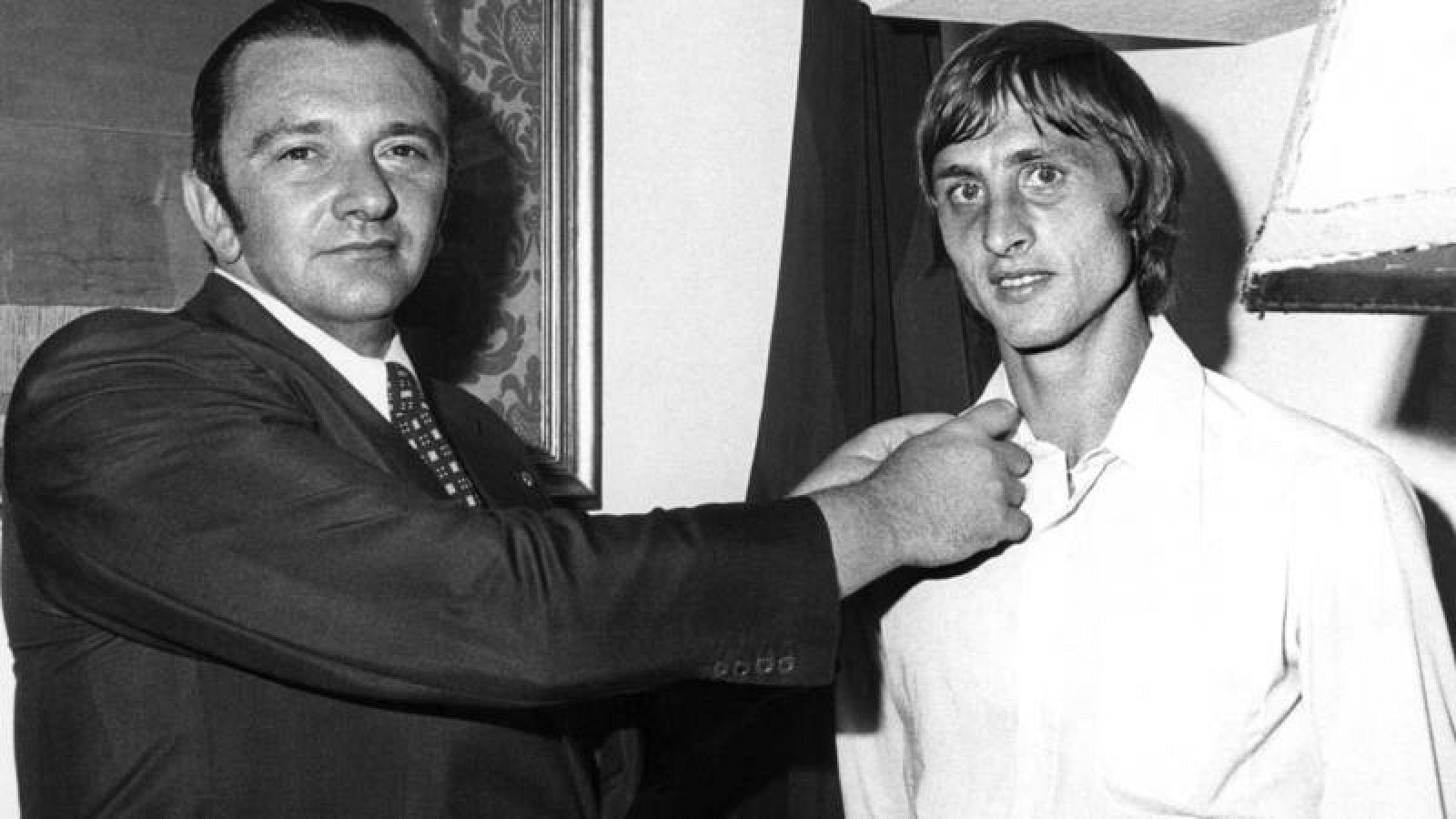 1973: tras obtener su tercera Copa de Europa consecutiva los dos clubes españoles más potentes se lanzaron por Cruyff. El Real Madrid, que manejaba informes de Miguel Muñoz desde 1967 aconsejando su fichaje, acordó con el Ajax 30 millones de € por el traspaso. Jaap van Praag, presidente de la entidad neerlandesa, vio la oportunidad de negocio cuando el Barcelona entró en escena, iniciándose una puja por el crack. Al faltar a su palabra con los madridistas, Santiago Bernabéu se negó en redondo a pagar más por un jugador por el que ya había alcanzado un acuerdo. Ello dejó vía libre a un Barça que pasó por dificultades para hacerse con el 14 pese a que éste llegó a amenazar al Ajax con retirarse del fútbol si no se concretaba su fichaje por un equipo por el que ya guardaba desde tiempo antes simpatías personales y políticas. Además estaba el hecho de haber coincidido con Rexach en Mallorca varias veces durante sus vacaciones, así como haber visitado a su apreciado Rinus Michels en la Ciudad Condal tras su llegada al club culé.